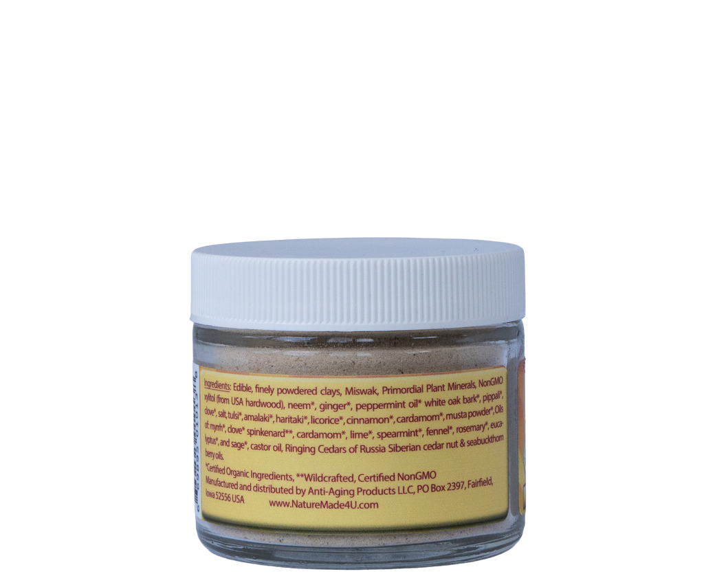Non-GMO xylitol (hardwood-derived), proprietary blend of fine mineral clays, fortified miswak, ginger*, licorice root*, white oak bark*, clove*, amalaki*, haritaki*, cinnamon*, tulsi*, echinacea*, cardamom*, yarrow*, pippali*, neem*, ancient sea salt; essential oils of peppermint*, clove*, myrrh*, wintergreen*, rosemary*.