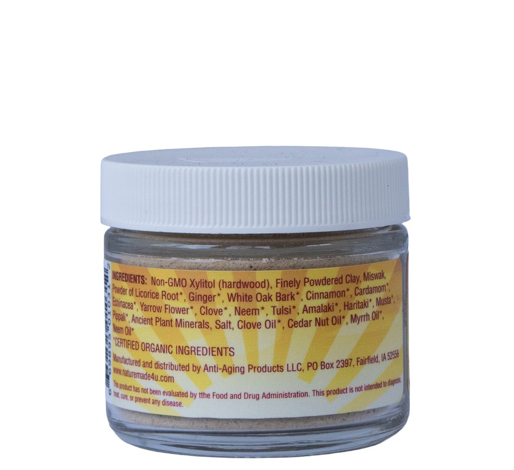 Non-GMO xylitol (hardwood-derived), proprietary blend of fine mineral clays, fortified miswak, licorice root*, white oak bark*, cinnamon*, cardamom*, ginger*, echinacea*, yarrow*, ancient sea salt, clove*, neem*, tulsi*, amalaki*, haritaki*, pippali*, myrrh oil*, cedar nut oil, neem oil*, and other certified-organic botanicals.